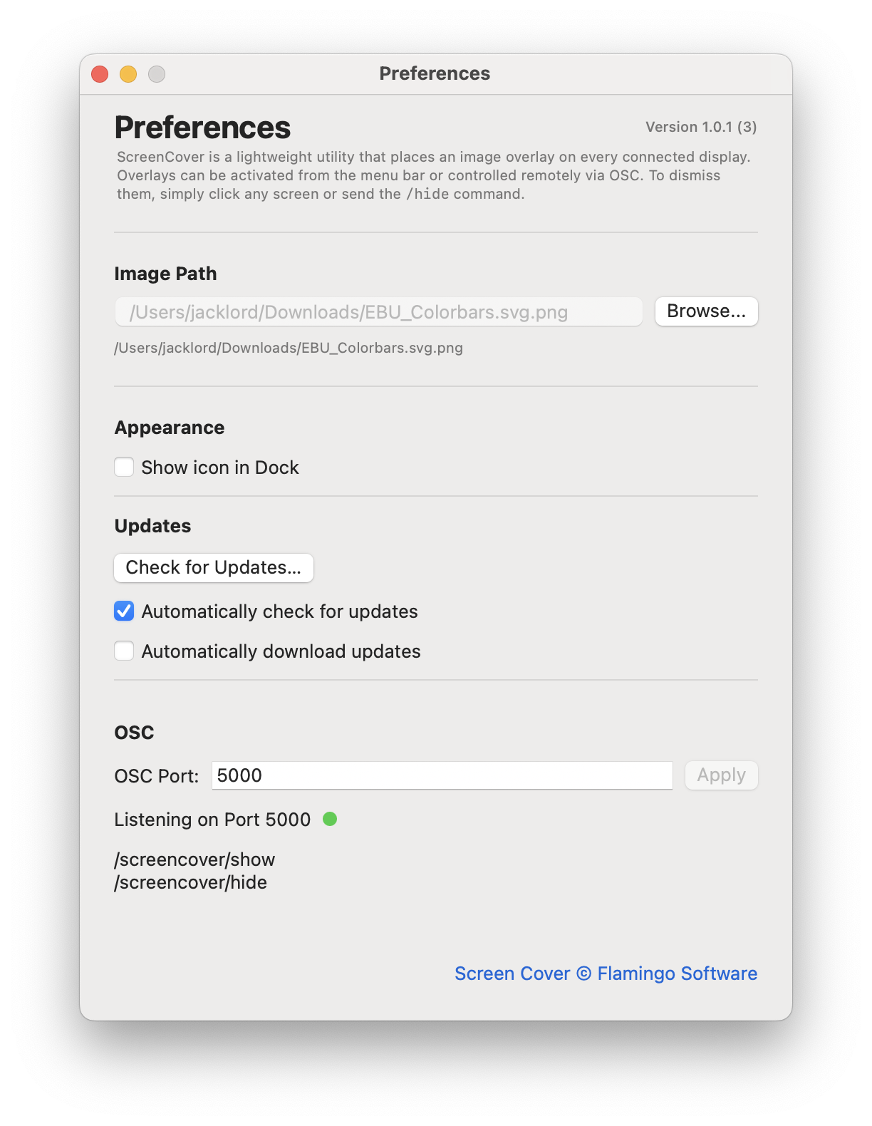 Screencover acts as an OSC-driven screensaver for live productions right from the menu bar, allowing show artwork or visuals to be displayed across every connected display. Ideal for FOH environments, it clears automatically on command or interaction.